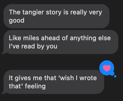 “And I will learn to read for you, only you, do not worry. Your first book will be my first read. I will be waiting here, understanding you through your books. And once you have your big breakup, you and your starlet part ways, you fly back here to Tangier and I will build you back up again. No more fights this time though.”