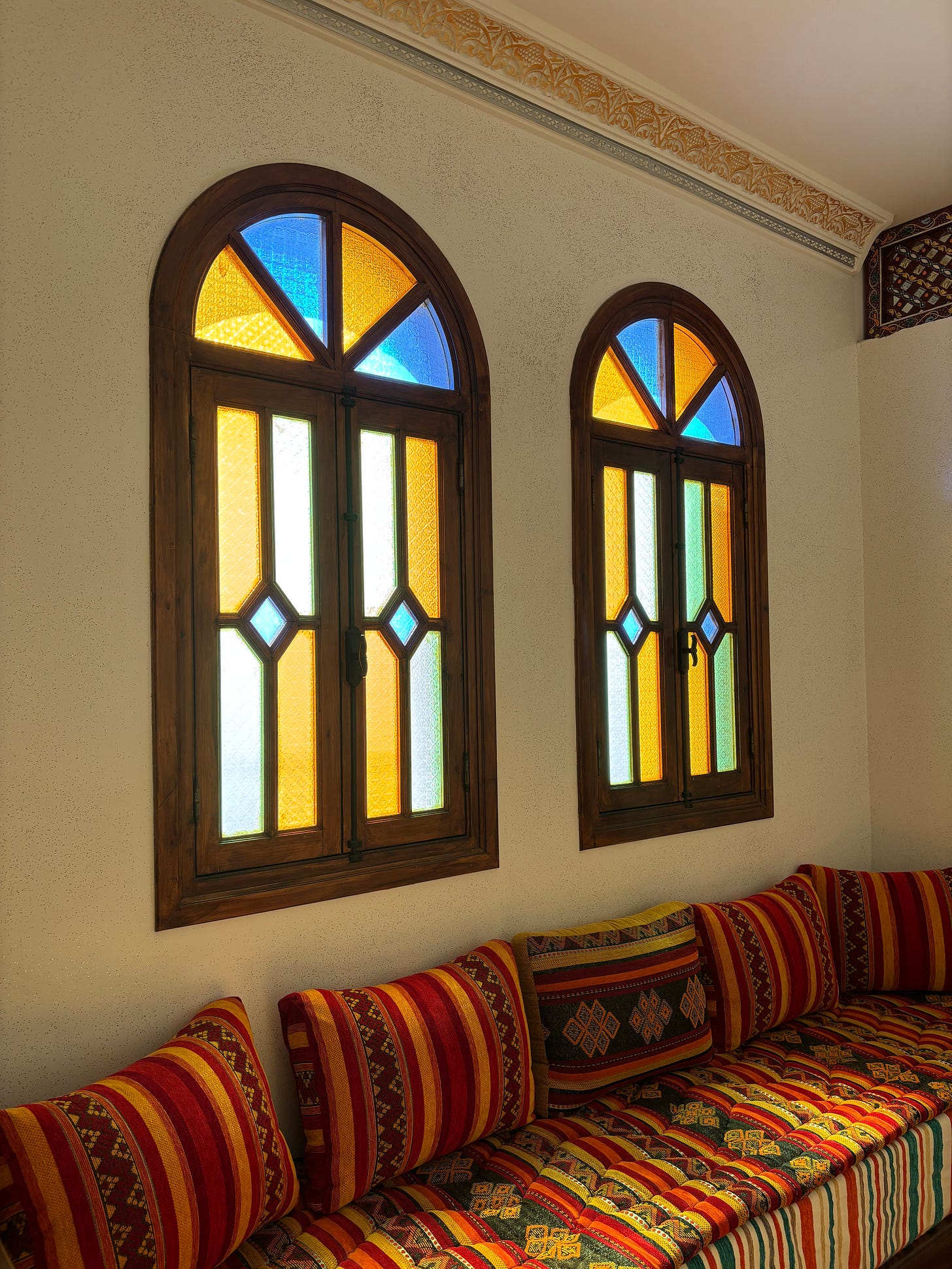 I awoke again and had the sun streaming in full force on my face. It was green and yellow and blue as it came through the stained glass window.