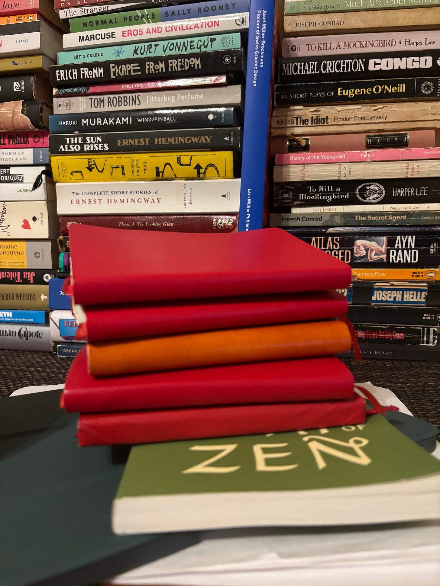 I tore at the plastic with my teeth, revealing the red underneath. Blood red. I spit the plastic into my hands and stuffed it into the pocket in front of me. I rummaged through the back pocket of my old notebook. Past the polaroids and film strips and movie tickets and receipts. I found the little shell and placed it in the pocket of the new notebook.