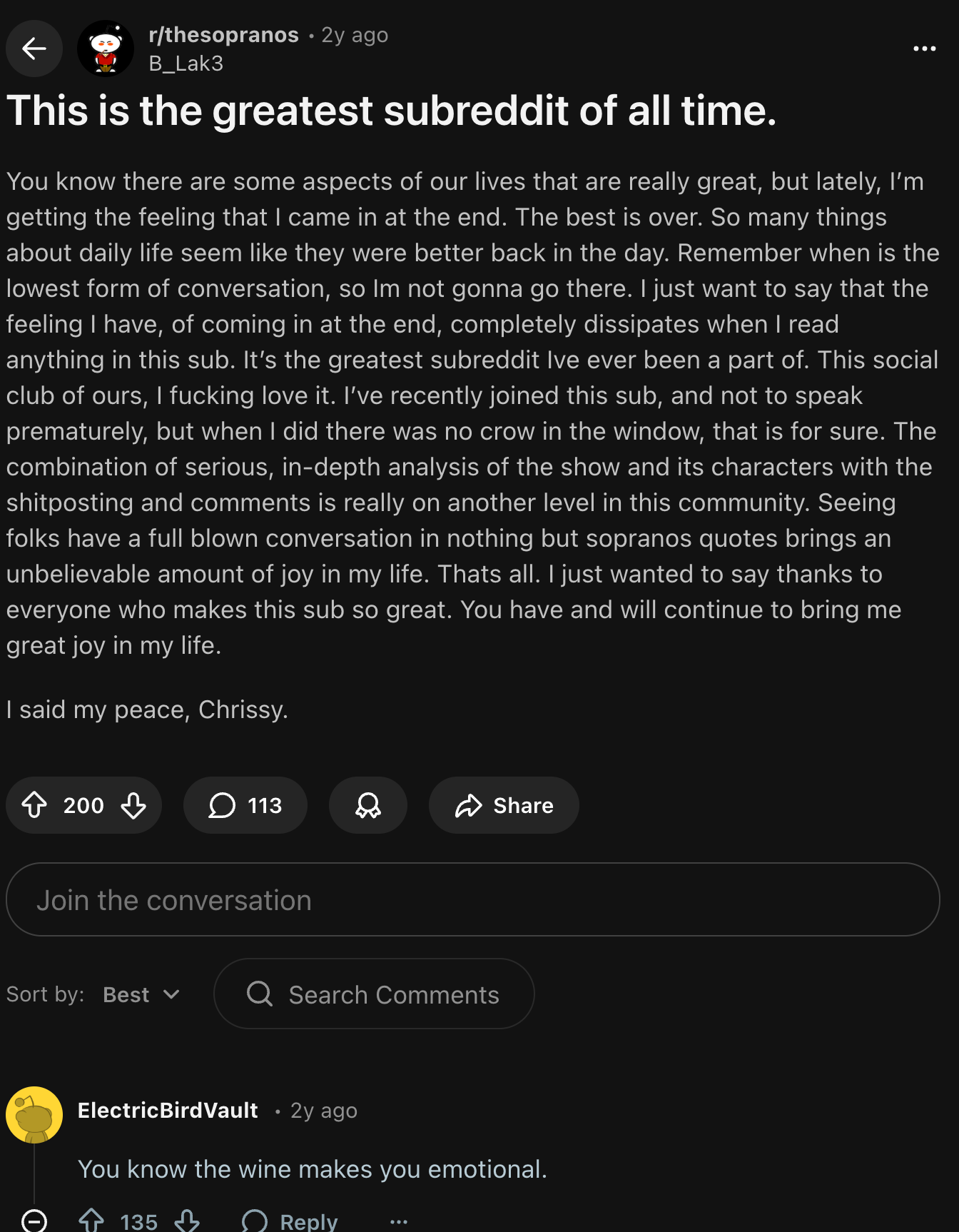 Then you head over the the Sopranos subreddit. Try to speak seriously there.